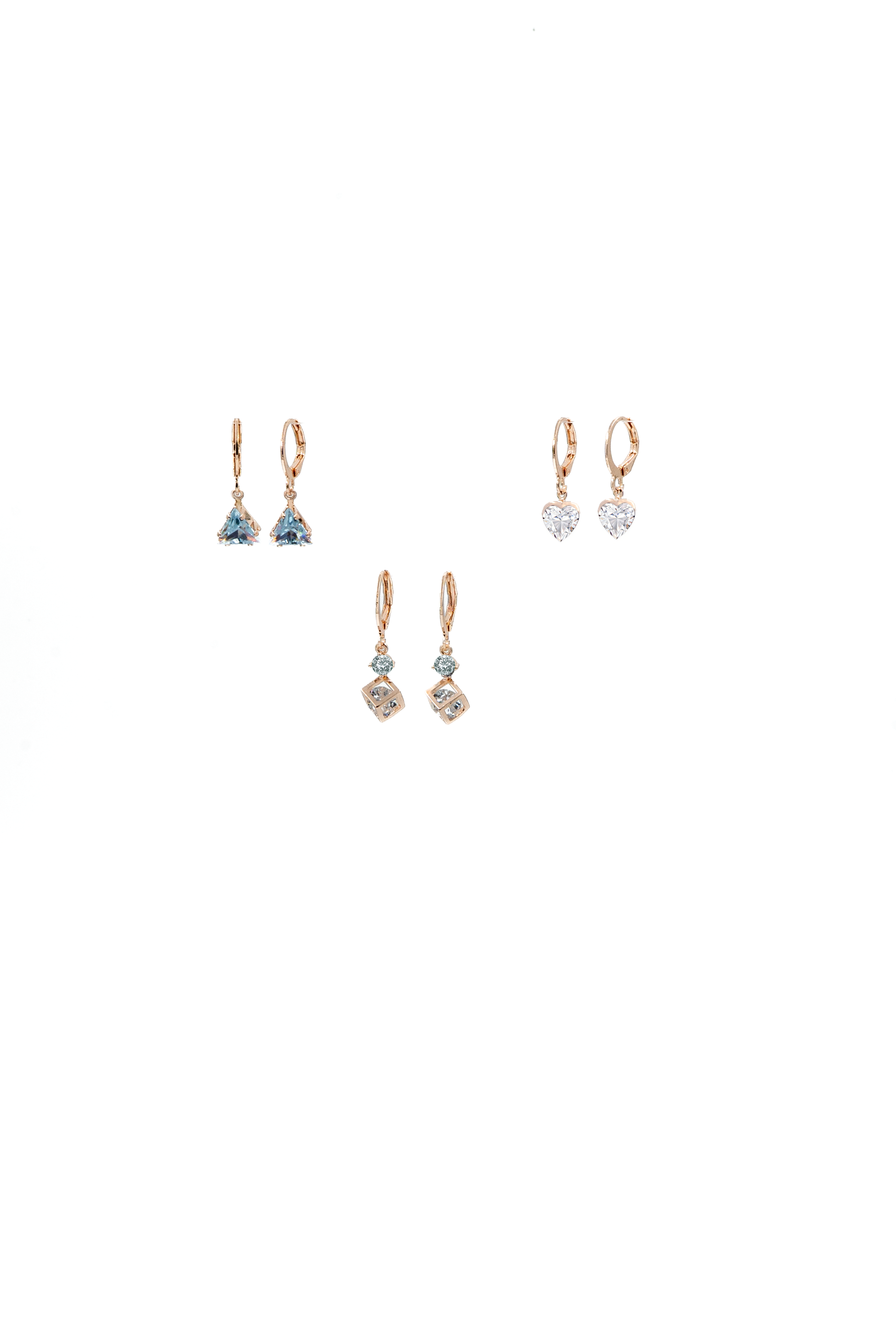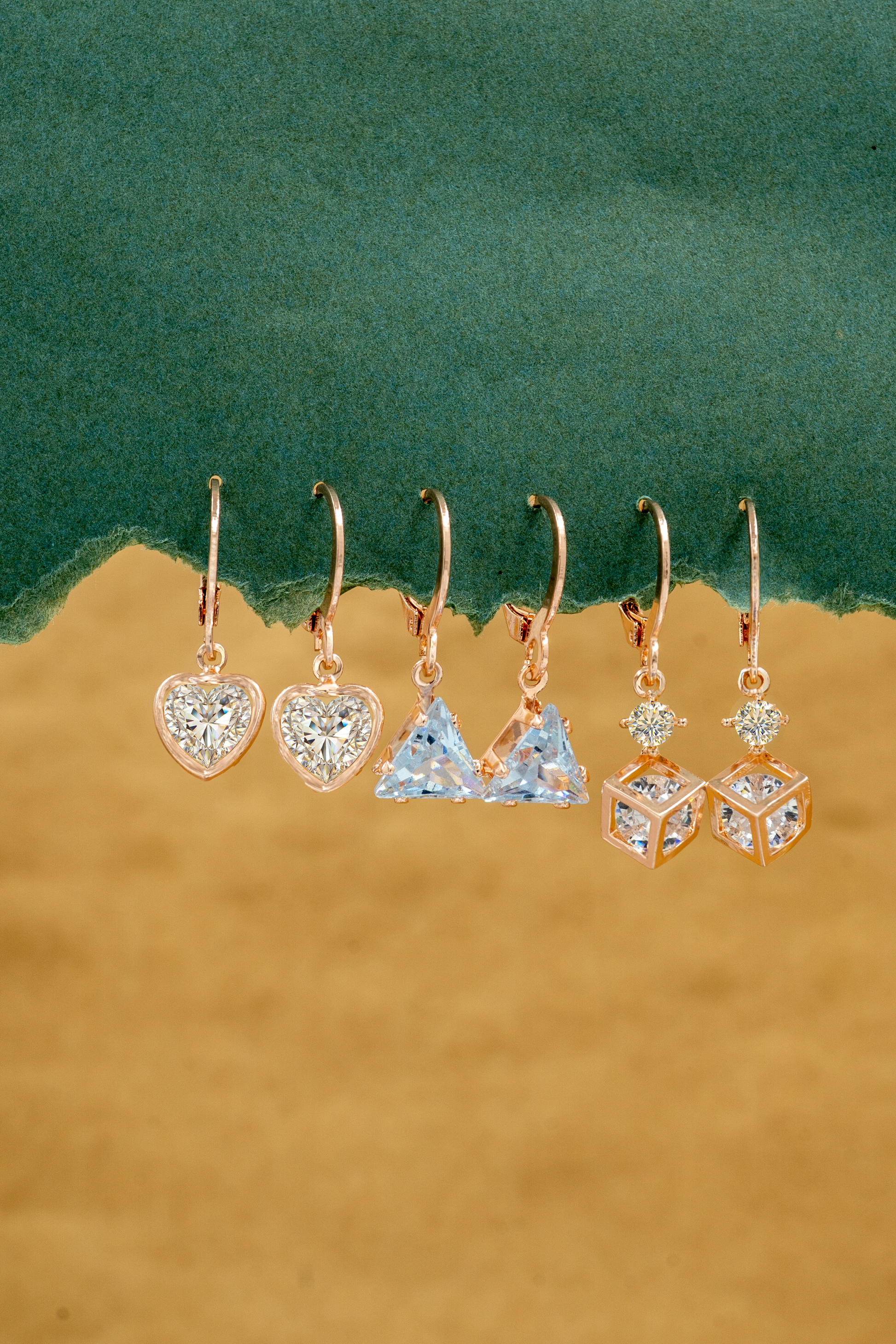 Playful and bold, the GeoCharm Drop Earrings feature a captivating mix of cube, heart, and triangle-shaped crystal charms. A perfect choice for those who love a modern, artistic twist in their jewelry collection.