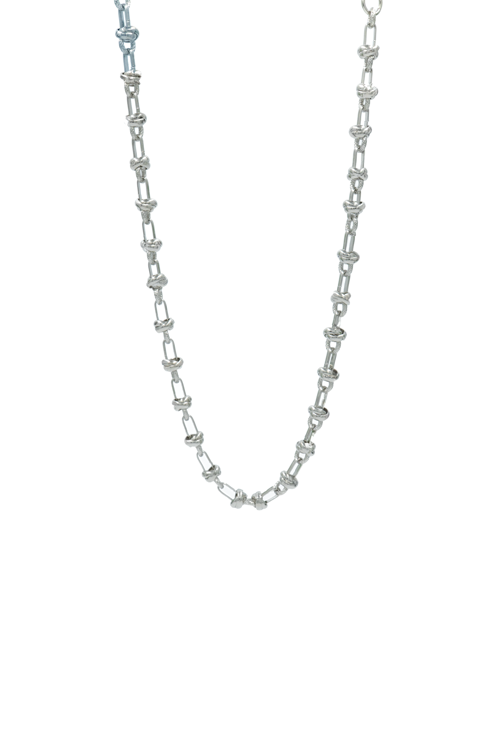 The Silver Orbit Knot Necklace showcases a striking arrangement of intricately looped silver links, creating a design that feels both modern and timeless. With its polished finish and bold character, this piece adds sophistication to any look, whether casual or formal.