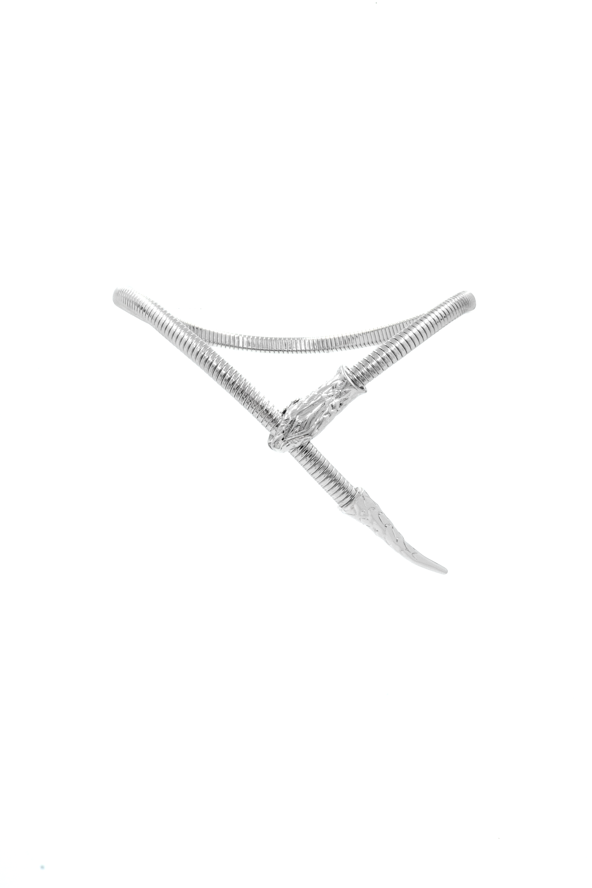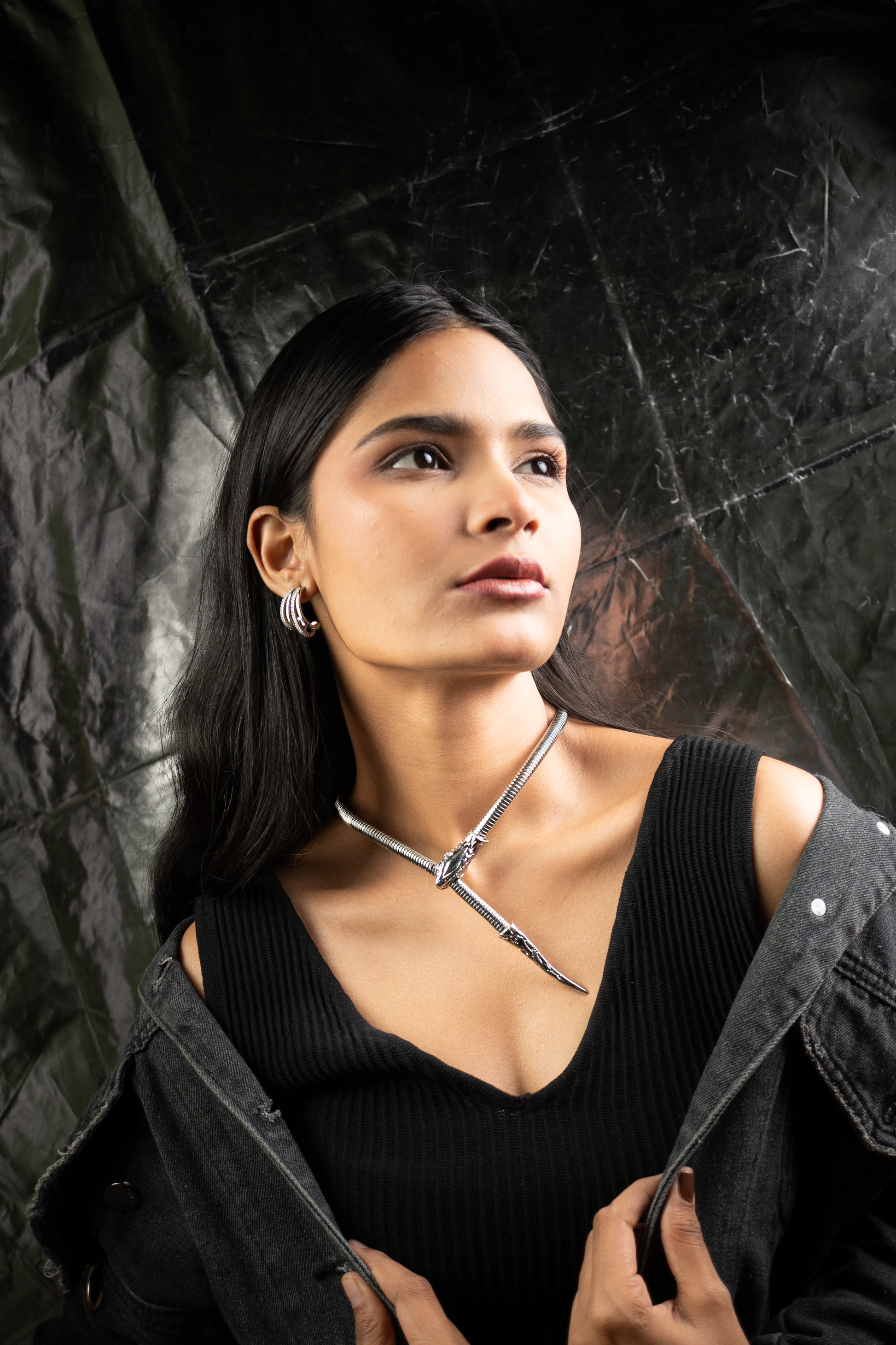 Unleash your inner power with the Silver Serpent Coil Choker. Crafted with intricate snakehead detailing and a flexible coil structure, this bold neckpiece wraps your neckline like armor. Designed for those who dare to stand out, this necklace is a fusion of elegance and edge