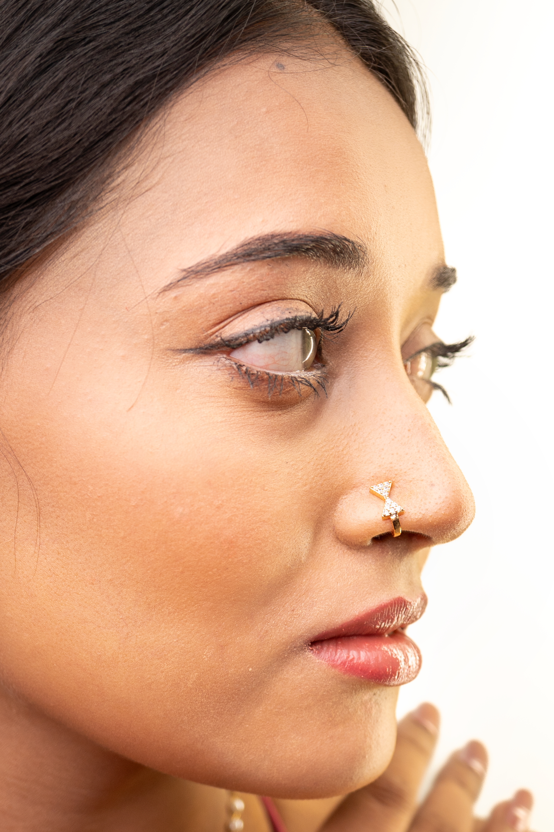 Add a playful touch of elegance with the Rose Bling Bow Nose Pin. Featuring a charming bow tie silhouette in rose gold, accented with radiant rhinestones, this piece brings a dash of sparkle and sophistication to your everyday look.