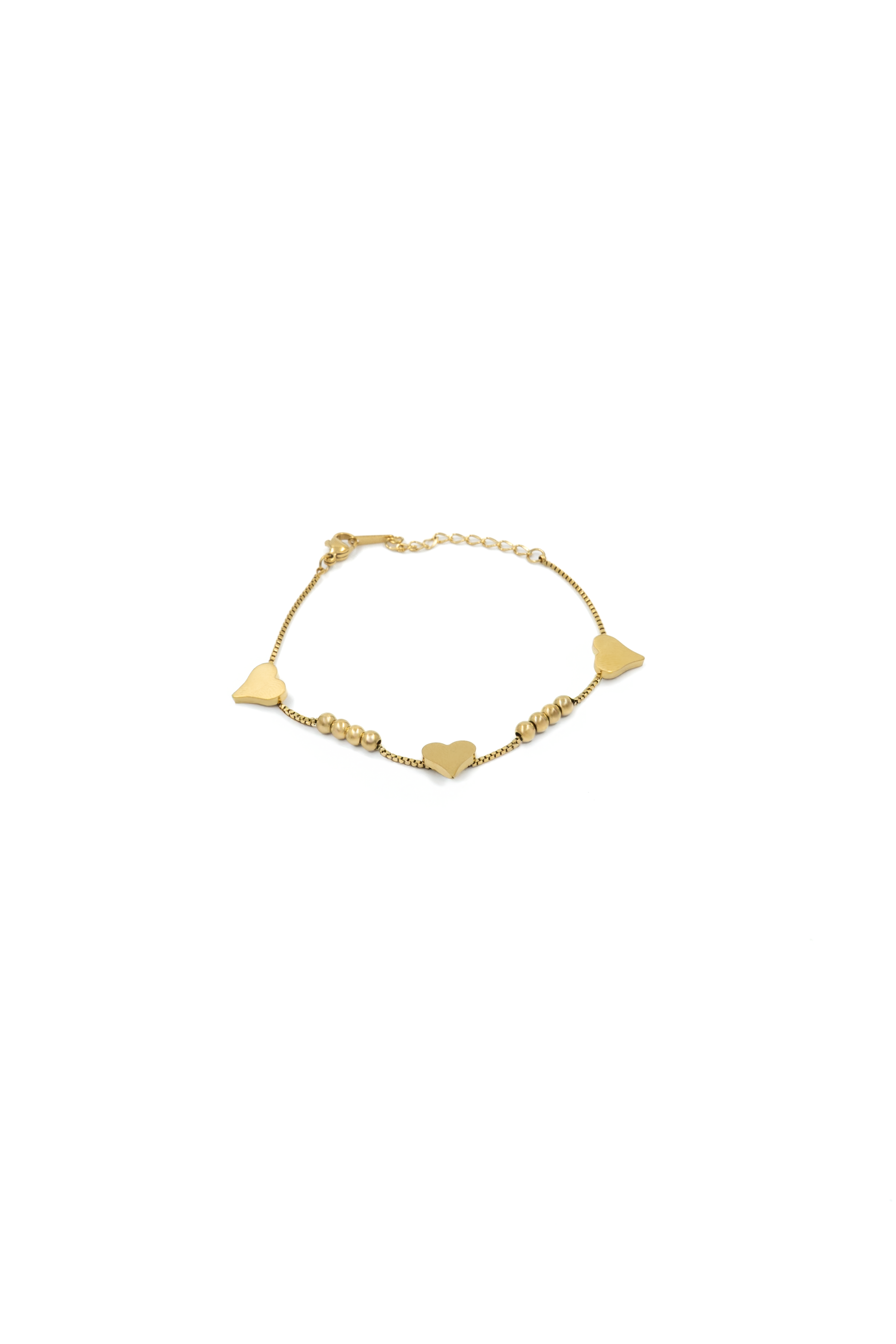 Celebrate love with this charming gold-plated bracelet featuring a series of polished heart-shaped charms interspersed with radiant golden beads.