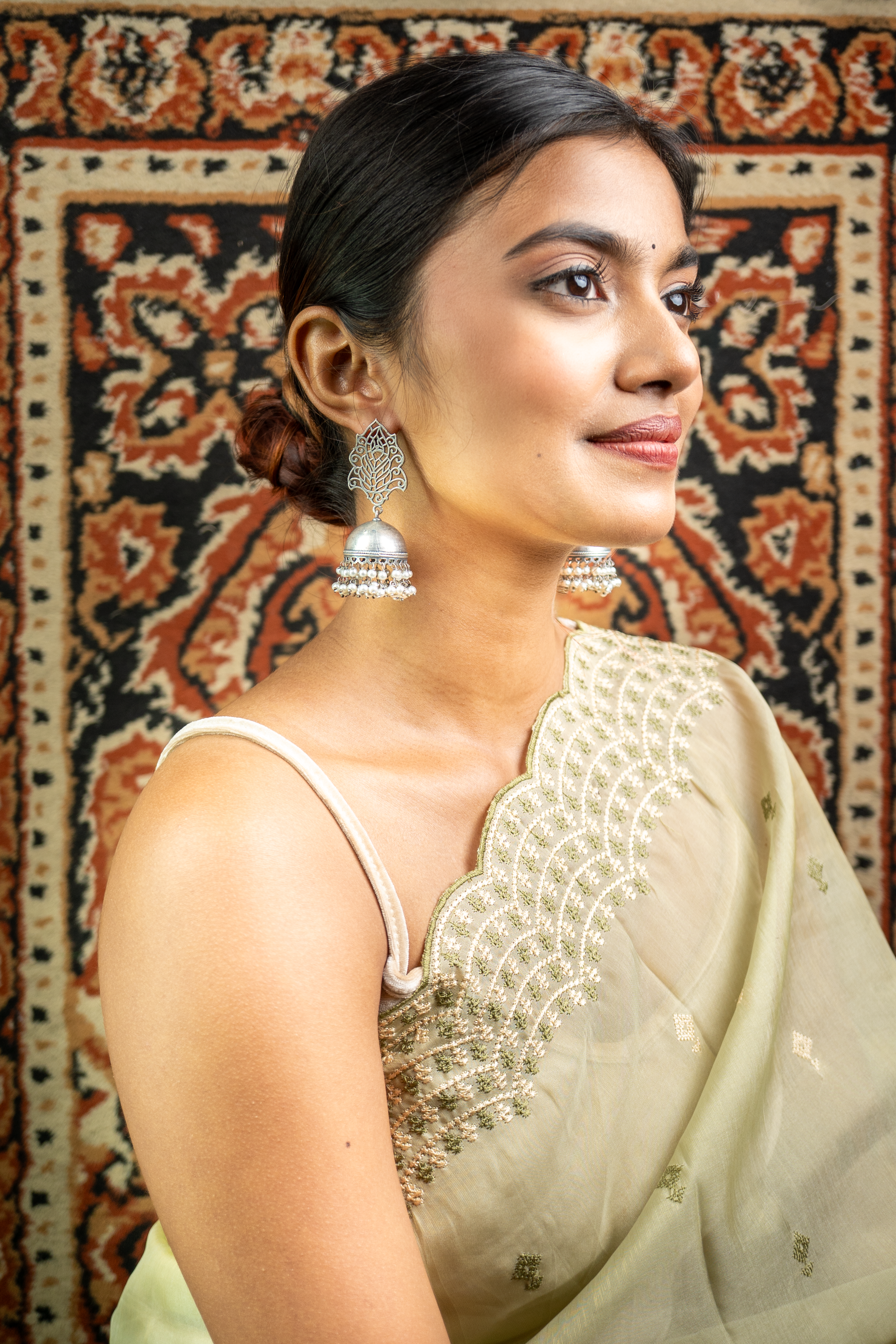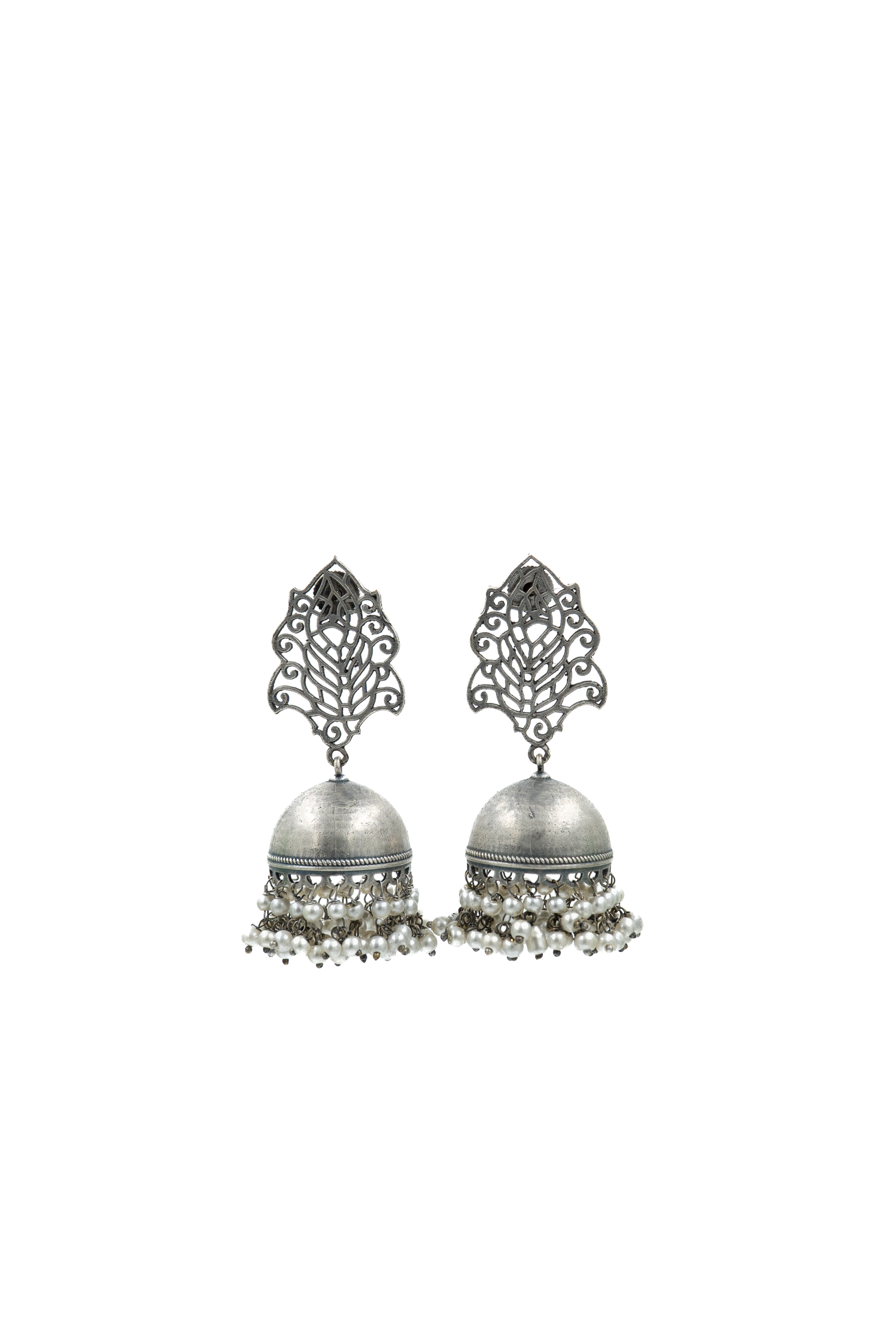 Elevate your ethnic style with the Rajvanshi Dome Jhumka, featuring a grand dome design adorned with cascading pearl clusters. The intricate filigree work on the top adds a royal touch to these timeless oxidized silver earrings.