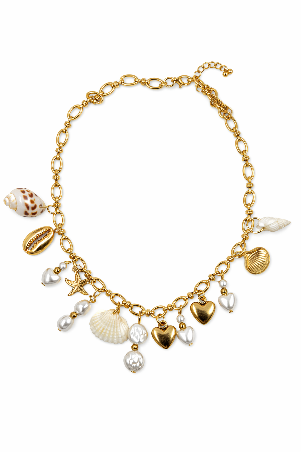 A gold-linked statement piece featuring a romantic blend of faux pearls,coastal shells,and heart -shaped charms